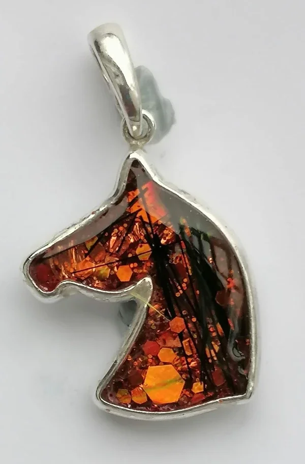 “I have just received the most beautiful silver horse head pendant in amber (with black flecks of tail hair ) from Pandora s Keepsakes , to remember my beloved horse Blackie .