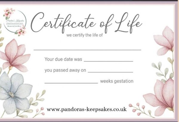 This heart-shaped pendant is handcrafted in Carmarthenshire and filled with care. You may choose to include ashes, a test lid, preserved flowers, or a black and white ultrasound photo—each one a tender tribute to your baby’s brief presence. A Certificate of Life is available if you wish, gently affirming that your baby mattered.